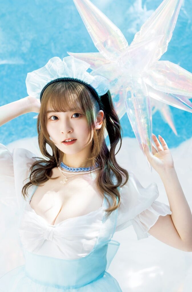 秋葉原の人気メイドカフェ『リリアンプリアン』の絶対的エースとして給仕しながら、アーティスト・作詞作曲家など、さまざまな顔を持つmewiが、同誌に初登場&初水着。メイド風の水着や、白い妖精をイメージした白い水着、フルーツを身体に巻きつけたフルーツの妖精、クラゲをイメージした海の妖精など、これまで見たことのないグラビアに挑戦。独自の感性と表現力を発揮している。