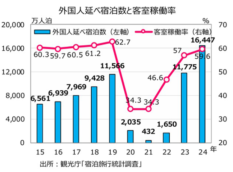 神様:おっしゃる通りです。一方で、実は国内宿泊施設の客室稼働率という観点で見ると、コロナ禍前である2019年の62.7%には現在も届いていません。2024年の客室稼働率は59.6%でした。2025年も4月、5月と61%を超えてはいますが、62.7%には届いていません。ここに客室稼働率を伸ばす、すなわち訪日外国人の受け入れをまだまだ増やせる余地があるとも考えられます。