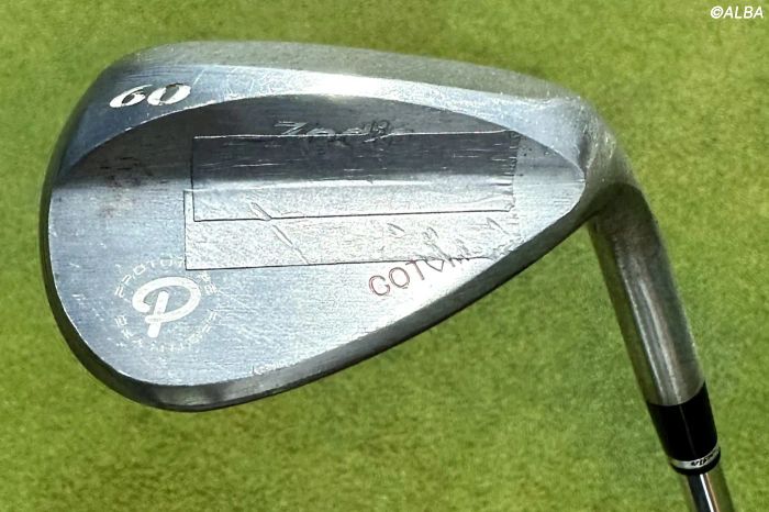 5本のウェッジの中でもゾディアの61度のプロトタイプはお気に入りだ。7月のオープンウィークの間に「グース強めでリーディングエッジがストレート系に削ってもらってカスタムしてもらいました」という池村仕様。どのウェッジを比べても超絶なグースになっている。