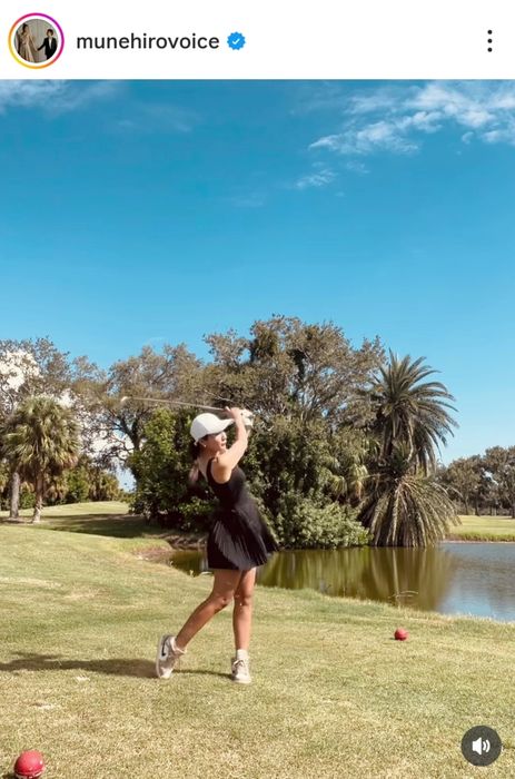 投稿では黒いミニワンピース姿でゴルフを楽しむ姿を公開。2枚目ではパー3のティショットの動画。ボールの行方を確認しながらカメラに戻ってくると、「お?」「やばっ!」と小さな声を上げていた。