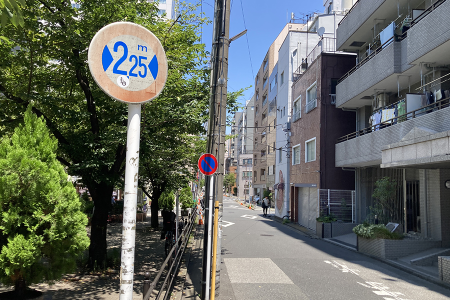 東京都江東区の繁華街の一角にも車幅制限「2.25m」の標識があります。他には川崎市の住宅街などでも見かけます。ただ、どの場所も、そこまで狭い道というわけではないのが不思議です。