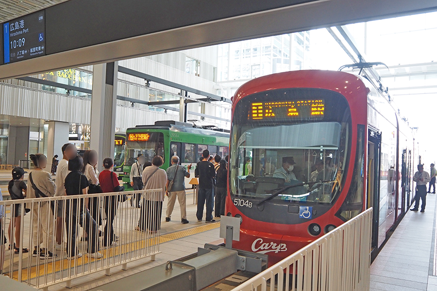 広電の新たな広島駅電停は、2025年3月に開業した広島駅ビル「ミナモア」の2階に開設されました。乗り入れのために比治山町交差点との間に約1.1kmの新路線「駅前大橋ルート」を整備し、広島駅前の地上にあった従来の広島駅電停は廃止されました。