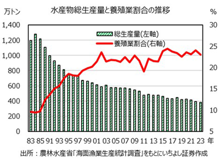 神様:漁業だけでなく、養殖業の生産量も減少傾向です。ただし、漁業生産量全体に占める割合では2割台を維持しており、横ばいです。一方で世界の養殖生産量は過去20年間で約3倍に拡大し、今後も拡大する見込みです。今後の将来性を見て、日本の養殖業の存在感が高まっています。
