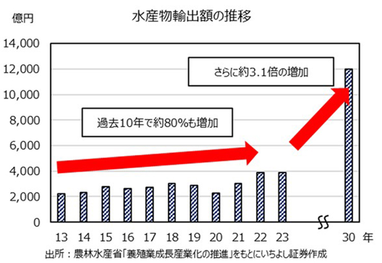 神様:農林水産省では、2030年までに水産物の輸出額を1.2兆円まで拡大させる目標を打ち出しています。2023年から実に約3.1倍の増加です。水産庁では養殖業を成長産業とするべく、目下取り組んでいるところです。
