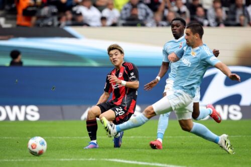 苦しい展開となったフランクフルトは攻勢を強めるも、ボールは回せどなかなか決定機まで持ち込めず。74分には堂安がボックス手前やや右寄りの位置から得意の左足を振り抜いたが、枠を捉えたミドルシュートは相手GKにセーブされた。それでも終盤に粘りを見せる。80分には堂安が右サイドから上げたクロスが起点となり、こぼれ球をウズンが押し込んで1点を返すと、87分にはヨナタン・ブルカルトがPKを沈めて一気に1点差まで詰め寄った。