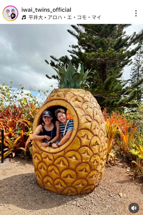 次戦に備えハワイ入りした岩井明愛&千怜 パイナップルのオブジェから顔を覗かせリラックスタイム