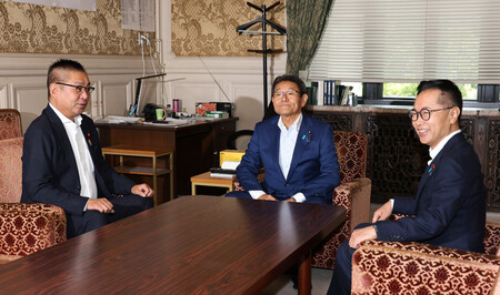 〔写真説明〕会談に臨む立憲民主党の笠浩史(中央)、日本維新の会の遠藤敬(左)、国民民主党の古川元久の各党国対委員長=30日午後、国会内