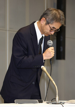 〔写真説明〕軽貨物車の車両使用停止処分を受け、記者会見で頭を下げる日本郵便の小池信也社長=1日午後、東京都千代田区