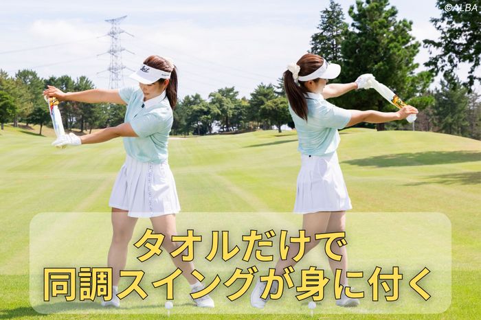 両腕を肩幅くらいに開いて、タオルをピンと張るように胸の正面で持ってください。このままアドレスの形を取り、体と手元の関係を変えずに素振りをします。このとき、なるべくタオルが真っすぐ見え続けるようにスイングしましょう。インに引き過ぎたり、外に上げたりするミスがなくなり、インパクトゾーンを長く使うイメージができると思います。
