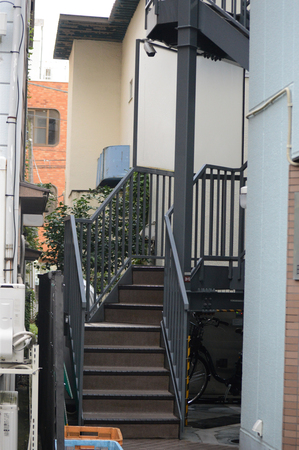 〔写真説明〕高齢女性が刺殺された事件があったマンションの外階段=1日、東京都町田市