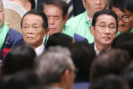 〔写真説明〕参院選の自民党候補者の決起集会に出席した同党の岸田文雄前首相(右)と麻生太郎元首相=7月17日、東京都千代田区