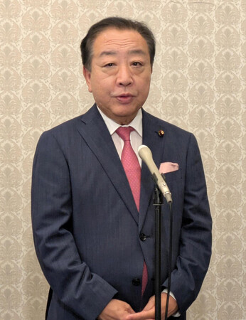 〔写真説明〕記者団の取材に応じる立憲民主党の野田佳彦代表=4日午後、千葉市