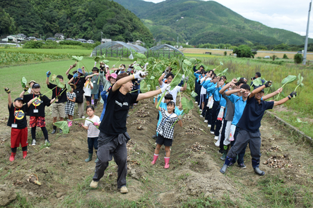 USAさんは、歌と踊りで全国の農業を盛り上げる「オドル野菜プロジェクト」に取り組んでいる。4月も大洲市に来訪し、子どもたちと里芋を植えた。地元の農家から里芋の収穫方法を教わった参加者は、スコップで里芋を掘った。収穫後は、USAさんの振り付け指導を受け、里芋の葉を手に持ちながら音楽グループZOOの「Choo Choo TRAIN」を踊った。【もぎたて便】