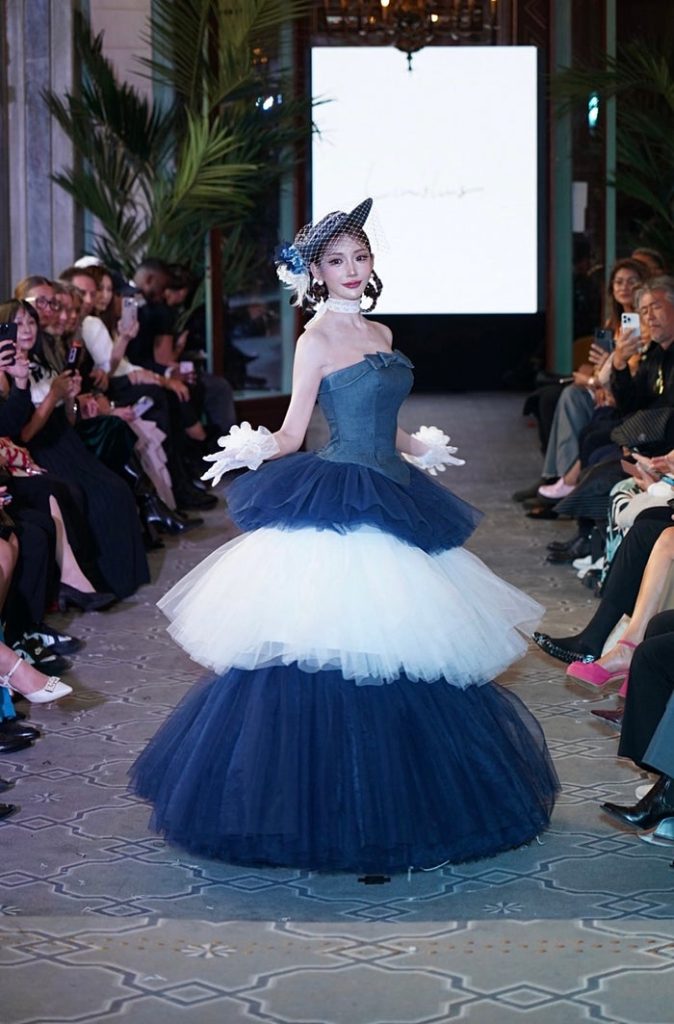 明日花は美しいデコルテが輝く白とブルーを基調とした華やかなドレス姿で登場。自身のブランドについて「Linslusが掲げる“繊細な優美さ”は、外見の華やかさだけでなく、努力や思いやりといった内面の美しさが調和してこそ生まれるもの。今日はまさに、その想いが形となった特別な日。パリでは思いがけないトラブルも多く、心が折れそうになる瞬間もありましたが、支えてくれた日本人チームの姿に励まされ、“絶対に成功させる”という想いで最後まで走り抜くことができました」とコメント。「14着すべてのドレスに魂を込めて臨んだ今回のショー。こうして世界の皆さまにお披露目できたことを、心から誇りに思います」と喜びを語った。