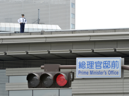 〔写真説明〕ドローン落下事件を受け、首相官邸の屋上を警備する警察官=2015年4月、東京都千代田区