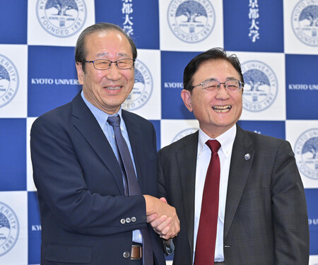 〔写真説明〕記者会見後に湊長博総長(右)と笑顔で握手する京都大の北川進特別教授=8日午後、京都市左京区