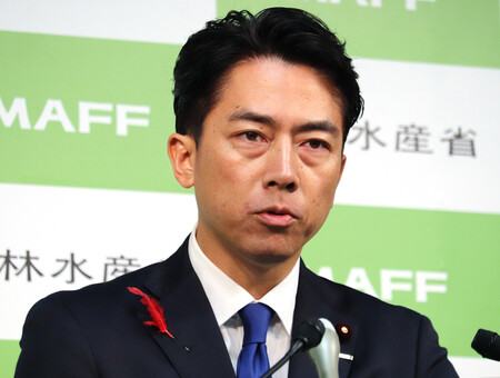 〔写真説明〕2025年産主食用米の予想収穫量について会見する小泉進次郎農林水産相=10日午後、同省
