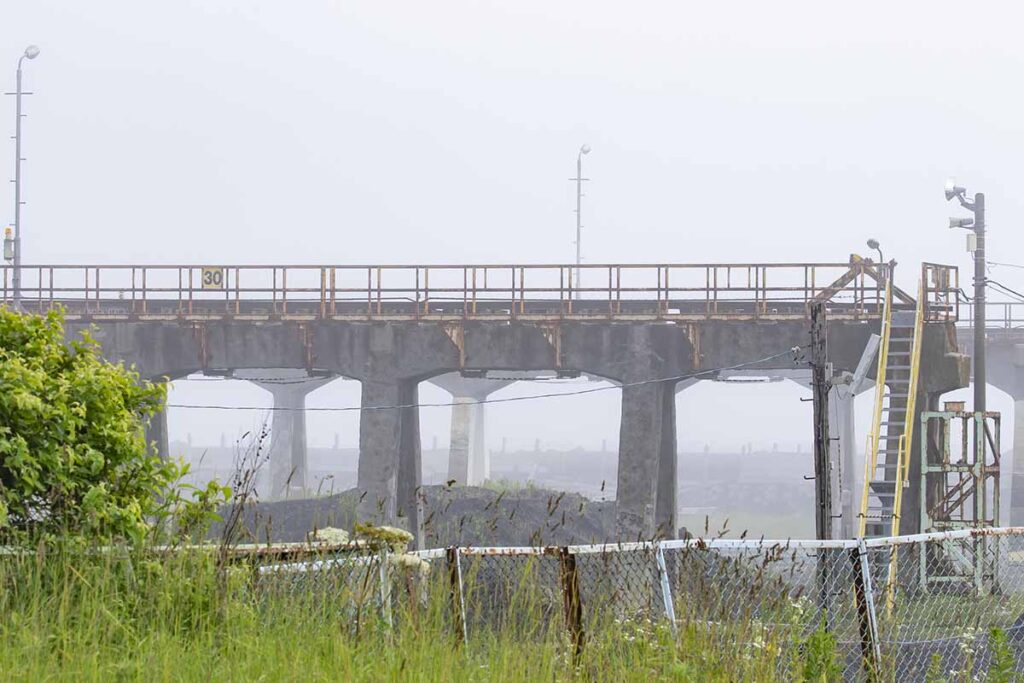 貯炭場があった知人駅跡では、独特なコンクリート造りの線路跡が見られます。霧に包まれた線路跡には、今にもディーゼル機関車と貨車が現れそうです。上から見ると、線路こそなくなったものの当時の雰囲気が感じられます。