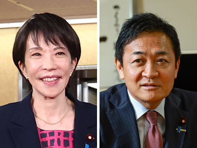 〔写真説明〕自民党の高市早苗総裁(写真左)と国民民主党の玉木雄一郎代表