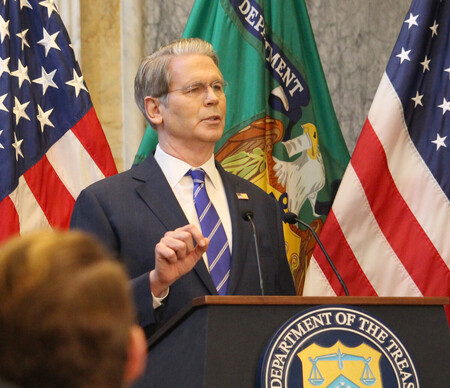 〔写真説明〕記者会見するベセント米財務長官=15日、ワシントン