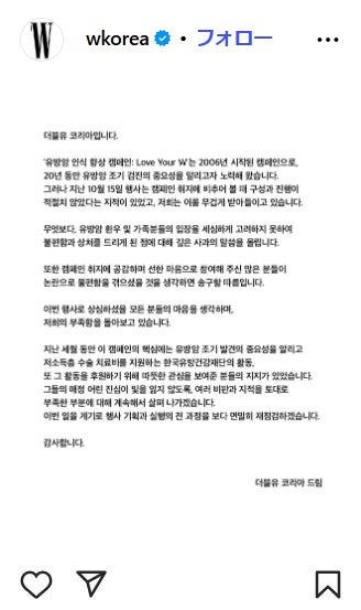 【モデルプレス=2025/10/19】韓国ファッション誌「W Korea」の公式Instagramが、10月19日に更新。同月15日に開催された「乳がん認識向上キャンペーン『Love Your W』」のイベント内容について、謝罪した。