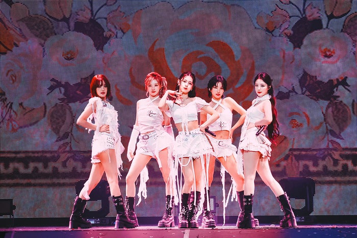 彼女たちの魅力のひとつはコンセプトの表現能力。ビジョンに『LATATA』と赤い文字で描かれ、『LATATA(Japanese ver.)』が始まり、多くのダンサーとともに真っ赤な衣装に身を包んだ5人が登場すると、ネボボのコールが響き渡っていく。ドラマティックなサウンドに、圧倒的なエナジーと美しさを同居させたパフォーマンスで一気に引き込み、サビでは炎が上がりさらに温度を上げると、一転、青い光の中で垂れ下がる幕の中から美しいシルエットでダンスを魅せる姿から『HANN(Japanese ver.)』が始まると、それぞれの個性がしっかりと伝わってくる。ウギの愛らしさにミヨンの華麗さ、シュファのしなやかな存在にミンニの親しみやすい愛おしさ、そして圧倒的なソヨンの主人公感がパフォーマンスから溢れ、大陸的なステージングとそのすべてが重なりあった神々しい美しさに目を奪われていく。