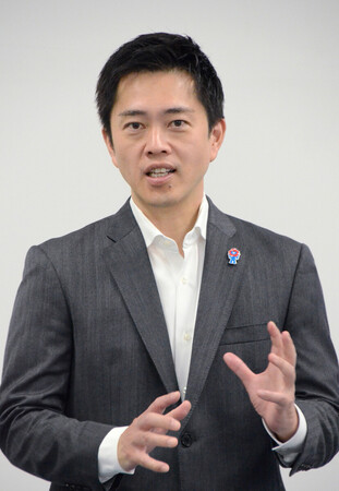 〔写真説明〕記者団の取材に応じる日本維新の会の吉村洋文代表=20日午前、大阪市中央区