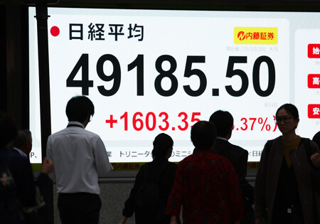 週明け20日の東京株式市場は、自民党と日本維新の会が連立政権の樹立で実質的に合意したことが好感され、全面高の展開となった。前週末の米国株高の流れも引き継ぎ、日経平均株価は大幅に反発。終値は前週末比1603円35銭高の4万9185円50銭と、9日に付けた史上最高値(4万8580円44銭)を上回り、初めて4万9000円台に乗せた。