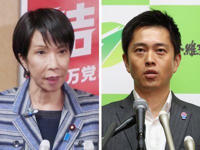〔写真説明〕自民党の高市早苗総裁(写真左)と日本維新の会の吉村洋文代表