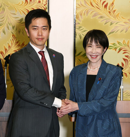 〔写真説明〕連立政権樹立の合意書を交わし、記者会見後に握手する自民党の高市早苗総裁(右)と日本維新の会の吉村洋文代表=20日午後、国会内