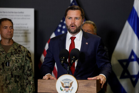 〔写真説明〕21日、イスラエル南部キリヤットガトで記者会見するバンス米副大統領(ロイター時事)