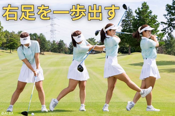 注意してほしいのは、一歩前に出す意識が強くなって、インパクト前に右足が前に出てしまうこと。これだとクラブの通り道がなくなって、パワーを伝えるどころかまともに振れません。必ずインパクトしてから右足を一歩前に出してください。