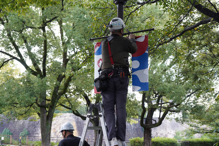 大阪・関西万博が13日に閉幕したことを受け、大阪市中心部の大阪城公園で20日、万博に関連したバナーフラッグが撤去された。市内の主要エリア約500カ所に設置されていた装飾の撤去作業は13日夜に始まり、月内に大半が外される見通しだ。万博一色だった街並みが元に戻りつつある。