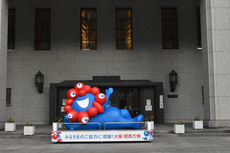 大阪・関西万博の公式キャラクター「ミャクミャク」の像が、市民に感謝を伝えるためだとして、大阪市役所の正面玄関に帰ってきた。万博の機運醸成の一環で、2023年12月に市役所前に像が設置された後、25年7月に会場に移設されていた。