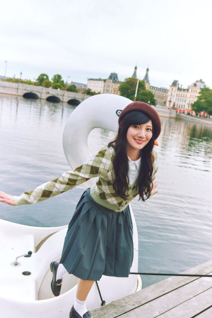 先行カット第12弾はコペンハーゲン最終日に河田が楽しみにしていたスワンボート乗り場でのショット。ロマンチックな街並みに挟まれた川でのんびりボートを漕いだ後、キュートな笑顔で船着場に降り立った瞬間の1枚に。ベレー帽×アーガイルカーディガンのプレッピーなコーディネートも見せている。