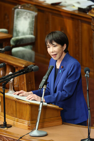 〔写真説明〕衆院本会議で所信表明演説をする高市早苗首相=24日午後、国会内