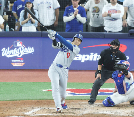 【トロント時事】米大リーグの今季王者を決めるワールドシリーズ(WS、7回戦制)は24日、カナダのトロントで開幕し、ア・リーグを制したブルージェイズがナ・リーグ覇者で大谷と山本、佐々木が所属するドジャースを11―4で破って先勝した。大谷は1番指名打者で出場して七回に2ランを放ち、4打数1安打2打点、1四球、2三振。大谷は2度目のWSで初本塁打。