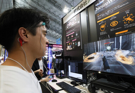 〔写真説明〕脳波と視線でゲームをプレーする人=9月25日、千葉市美浜区の幕張メッセ
