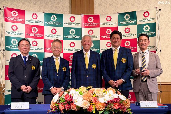 会見には、昨年から名誉トーナメントアドバイザーを務める国内ツアー通算51勝の青木功、フェニックス・シーガイア・リゾート取締役副社長の片桐孝一氏、宮崎市観光協会常務理事兼事務局長の長田将明氏、同大会トーナメントディレクターの中森一将氏、フェニックス・シーガイア・リゾートフェニックスカントリークラブ総支配人の白濵孝浩氏が登壇した。