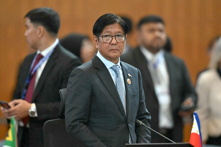 〔写真説明〕27日、クアラルンプールで東アジアサミット(EAS)に臨むフィリピンのマルコス大統領(AFP時事)
