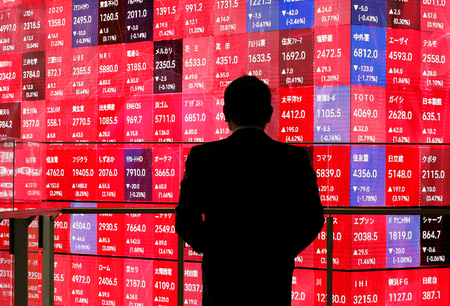 〔写真説明〕東証の株価を表示する大型ディスプレー=27日、東京都中央区(EPA時事)