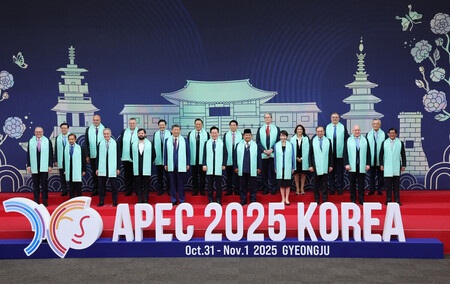 〔写真説明〕アジア太平洋経済協力会議(APEC)首脳会議で、記念撮影に臨む高市早苗首相(右から7人目)ら各国首脳=1日午後、韓国・慶州