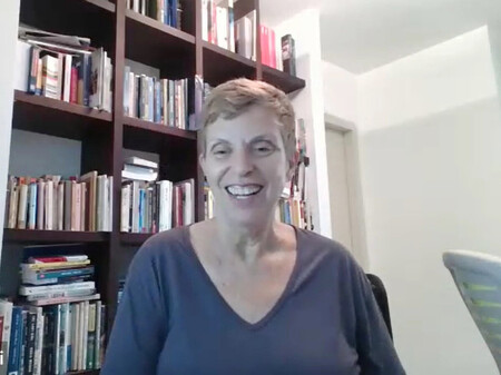 〔写真説明〕オンラインでインタビューに答えるイスラエルの市民団体「平和に挑む女性(WWP)」代表のヤエル・アドミさん=10月16日