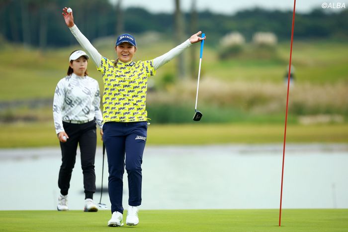 だが、そんな疲れを吹き飛ばす一打が、最終9番パー4で訪れた。アゲンストのなか残り157ヤードから6番アイアンで放った2打目が、カップ手前1メートルほどに落ちてそのままカップイン。「下り(奥)にはつけたくないと思って打ったら、運よく入ってくれました」。見事なショット・イン・イーグルを決め、グリーン上では思わずバンザイも飛び出した。