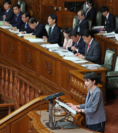 〔写真説明〕参院本会議で、立憲民主党の水岡俊一参院議員会長が行った代表質問に答える高市早苗首相=5日午前、国会内
