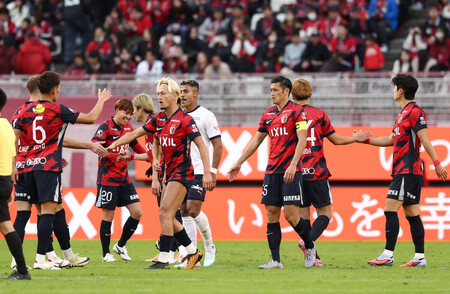 〔写真説明〕横浜Cに勝ち、喜ぶ鹿島イレブン=8日、メルスタ