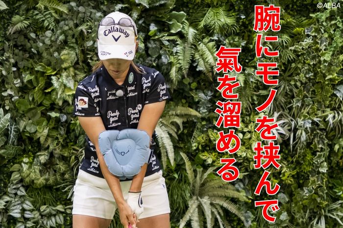 ところが先生が亡くなった後、自分なりに勉強するうち気が付いたことがあり、ボクなりに考案した練習がありました。というのは室伏さんが語っていたトレーニングと似たもので、クッションを両腕(前腕部分)に挟んでのアドレスです。両腕で挟むのはクッションでなくても構いません。ヘッドカバーを挟んでやらせたこともありました。どのような選手にやらせるかといえば、スイング中に軸がブレる選手にです。そういう選手には目をつぶらせることで、より意識が内に中に集まることが理解できるようになりました。このとき、集中する意識が氣であり、それが集まる体の内の部位が臍下丹田なのです。