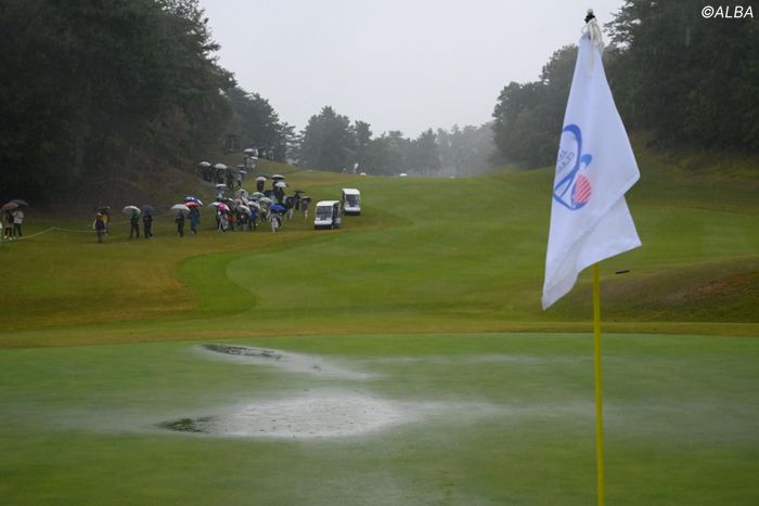日米共催大会の最終ラウンド。悪天候によるコースコンディション不良のため、午前10時57分から競技中断となっている。グリーンには水が浮き上がっており、選手たちはクラブハウスへと引き上げている。
