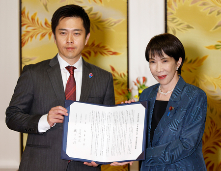 〔写真説明〕連立政権樹立の合意書を交わす自民党の高市早苗総裁(右)と日本維新の会の吉村洋文代表=10月20日、国会内(EPA時事)