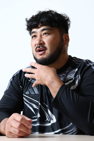 〔写真説明〕インタビューに答えるプロラグビー選手の大西将史さん=4日、東京都世田谷区